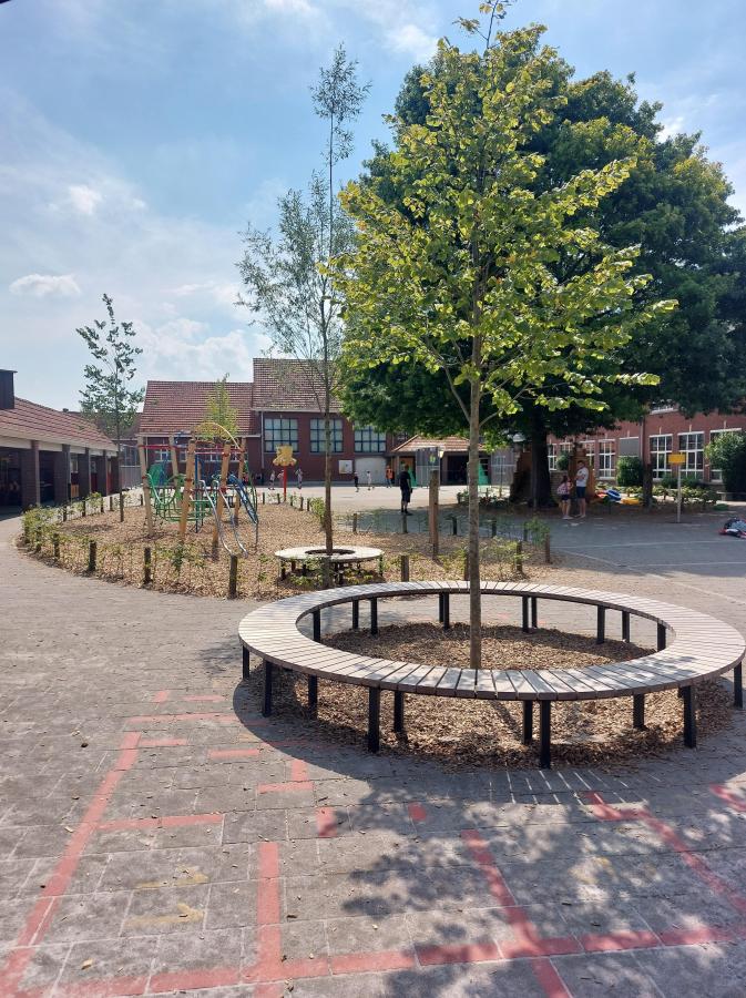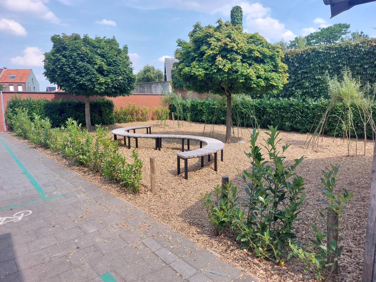 Tijdens de zomervakantie van 2023 heeft het lokaal bestuur de speelplaats van de Gemeentelijke Lagere School De Wegwijzer onder handen genomen. Met de werken hebben we ongeveer 30 % van de niet-overdekte speelplaats onthard, goed voor een oppervlakte van 652 m². De originele valbeveiligingszones in rubber werden vervangen en uitgebreid door zones in houtschors gecombineerd met bij- en kindvriendelijke aanplantingen. Om extra speelgenot en comfort te realiseren is er ook een speelheuvel en boombank geïnstalleerd. Bijkomend zullen er nog extra boombanken en wilgenhutten geplaatst worden. Met het realiseren van deze klimaatvriendelijke speelplaats zetten wij onze schouders onder de strijd tegen de te hoge verhardingsgraad. Bovendien komt dit project de ontwikkeling van de kinderen en hun milieugedrag ten voordelen.
