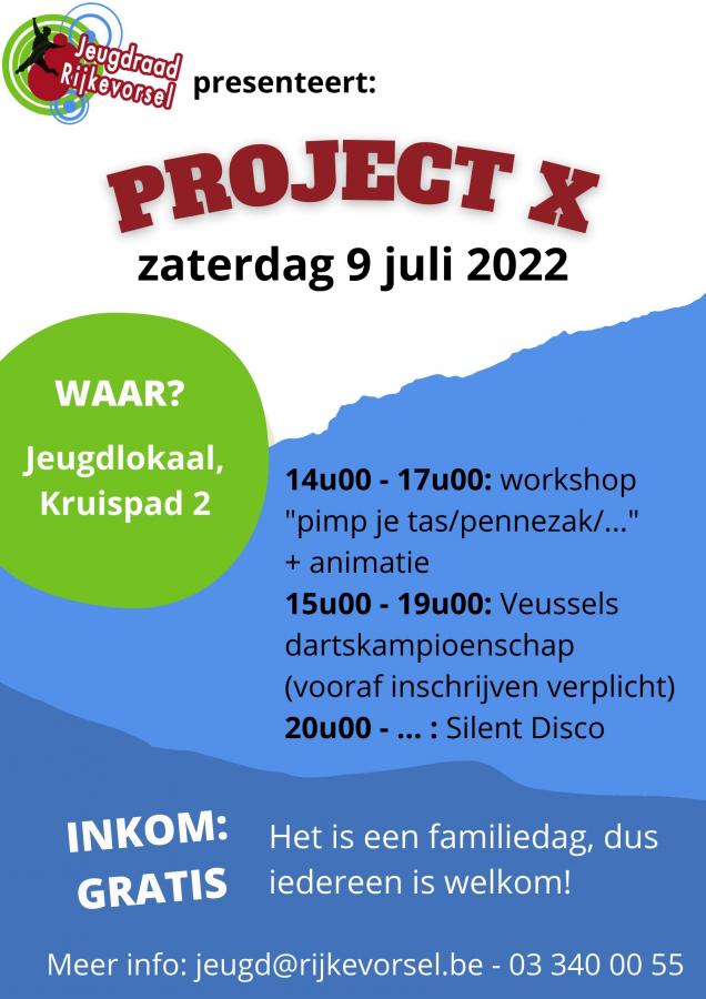 Op zaterdag 9 juli 2022 organiseert de jeugdraad van Rijkevorsel weer het gratis familie-evenement ‘Project X’. Jong en oud is van harte welkom in en rond het jeugdlokaal (Kruispad 2) voor een namiddag vol spelplezier.