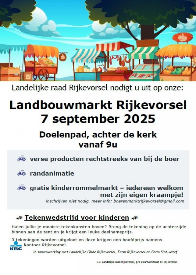 Op zondag 7 september organiseert het Landbouwcomité, in samenwerking met Landelijke Gilde Rijkevorsel, Ferm Rijkevorsel en Ferm Sint-Jozef, de jaarlijkse landbouwmarkt in het Doelenpad. Op de boerenmarkt tonen onze Rijkevorselse landbouwers van 9.00 tot 13.00 uur hun specialiteiten aan het grote publiek en bieden deze ook te koop aan. Er is randanimatie voor jong en oud en er zijn lekkere snacks verkrijgbaar.