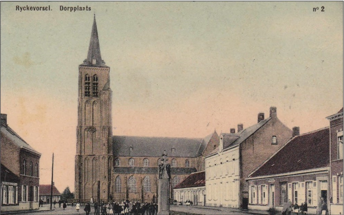 Op deze foto staat het dorpsplein, eerst De Plaetse en later ook Drieske genoemd. In het midden stond een waterpomp in arduin ter beschikking van de bevolking. Links naast de kerk bemerkt men een boerderij. Ze stond waar nu de rotonde is.