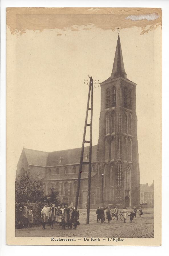 De kerk vanaf de Molenstraat. Op de voorgrond staan zwarte, hoge houten palen. Ze dienden om de elektriciteitsdraden te dragen. De leidingen hingen hoog in de lucht. Dikwijls knapten ze af bij slecht weer, met als gevolg dat er geen elektriciteit meer was voor de inwoners die er op aangesloten waren.