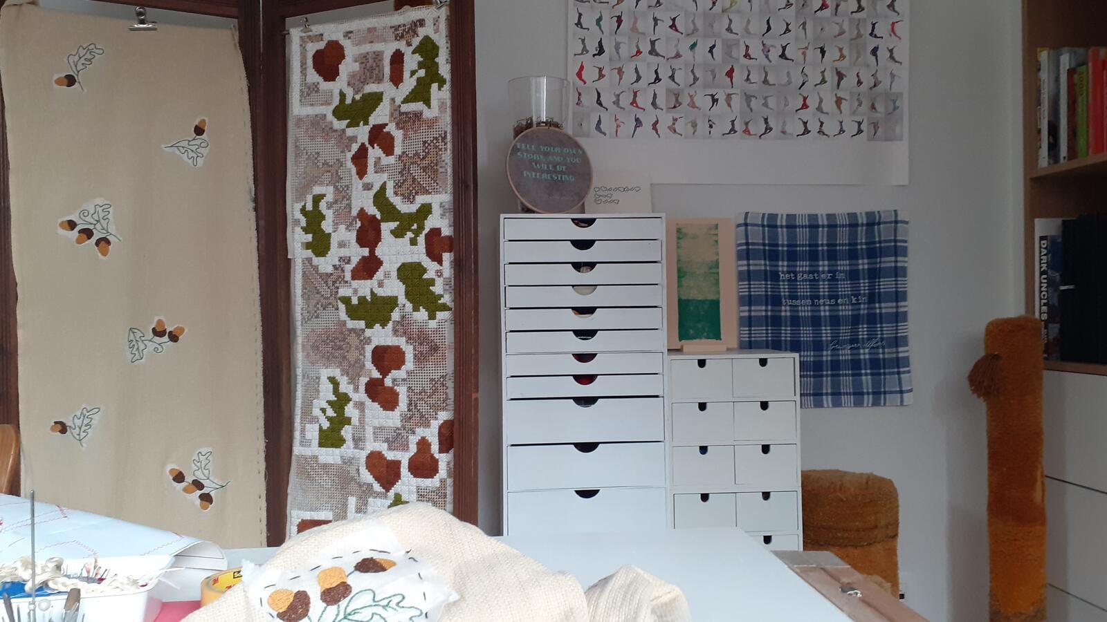 Ga langs bij Leen Sprangers tijdens Atelier in beeld. Leen werkt vooral met tactiele materialen die een verleden hebben, zoals garen, stof, … Die bewerkt ze met verschillende (handwerk)technieken. Veel van haar werken roepen nostalgie op, vaak met een grafische toets.