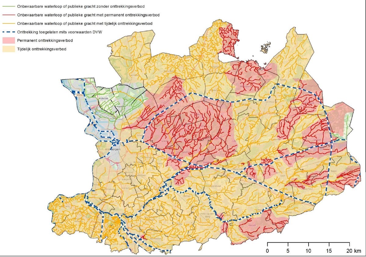 Op 19 juni en 2 juli werd het verbod al aanzienlijk uitgebreid. Voor bijna het volledige grondgebied van de provincie geldt inmiddels een onttrekkingsverbod, met enkel nog enkele lokale uitzonderingen waar wateronttrekking onder voorwaarden is toegestaan. Het tijdelijk verbod voor Groot Schijn, Bendenvliet, Grote Molenbeek en Zielbeek zijn de enige wijzigingen tegenover het bestaande tijdelijk onttrekkingsverbod dat sinds 19 juni en 2 juli van kracht is.